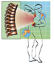 Also, an injury or stress in one area, can lead to additional problems in a kind of "domino effect." For instance, a simple muscle strain may cause you to compensate by carrying your weight differently which can lead to an overall imbalance in the spine or strain on different muscles creating additional problems.
